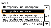 Всички настройки за факс са поместени с кратки описания в списъка. Настройките по подразбиране са отбелязани с кръстче (
