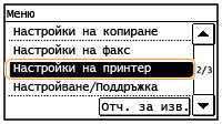 Всички настройки за принтера са поместени с кратки описания в списъка. Настройките по подразбиране са отбелязани с кръстче (