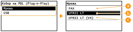 Изберете език за описание на страници, така че машината да се разпознава като принтер, който е съвместим с този език, когато я свързвате към компютър чрез функцията "Plug and Play". За повече информация вижте MF Driver Installation Guide (Ръководство за инсталиране на MF драйвера).