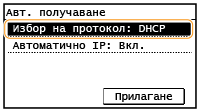 ![]() Ако е изведено <Вкл.>, докоснете <Автоматично получаване> и задайте за <Избор на протокол> и за <Автоматично IP> настройка <Изкл.>.