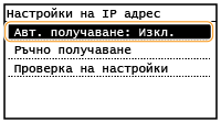 ![]() ![]() Ако не желаете да използвате DHCP/BOOTP/RARP сървър за присъединяване на IP адрес Изберете <Изкл.>. Ако изберете <DHCP>, <BOOTP> или <RARP>, когато тези услуги са недостъпни, машината ще изгуби време и комуникационни ресурси, за да търси тези услуги в мрежата. |