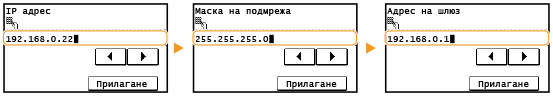 <Маска на подмрежа> <Адрес на шлюз>.Въведете всяка настройка чрез бутоните с цифри и докоснете <Прилагане>.