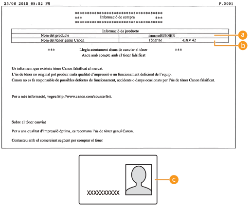 Especifiqueu que cal imprimir la informació de compra de consumibles. S'imprimeixen els elements següents: