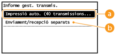 Seleccioneu <On> per imprimir l'informe automàticament cada 40 transmissions o <Off> si no voleu imprimir automàticament l'informe.