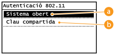![]() Quan <Sistema obert> està seleccionat Quan es connecta a una xarxa LAN sense fil, l'equip produeix un error d'autenticació si l'autenticació de clau compartida s'estableix a l'encaminador sense fil. Si això passa, l'equip canvia automàticament l'opció a <Clau compartida> i recupera la connexió. |