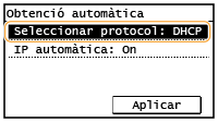 ![]() Si apareix <On>, toqueu <Obtenció automàtica>, i establiu <Seleccionar protocol> i <IP automàtica> en <Off>.