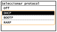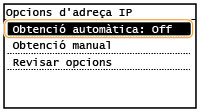![]() ![]() Si no voleu utilitzar DHCP/BOOTP/RARP per assignar una adreça IP Seleccioneu <Off>. Si seleccioneu <DHCP>, <BOOTP> o <RARP> quan aquests serveis no estiguin disponibles, l'equip perdrà temps i recursos de comunicació cercant la xarxa per a aquests serveis. |