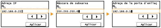 <Màscara de subxarxa> <Adreça de la porta d'enllaç>.Introduïu cada configuració amb les tecles numèriques i toqueu Aplicar>.