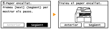 Si un paper s'encalla, apareix <Paper encallat.> a la pantalla. Premeu Següent per veure solucions senzilles a la pantalla. Si els procediments que es mostren resulten difícils d'entendre, vegeu les seccions següents per treure els papers encallats.