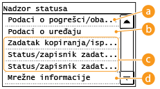 Prikazuje status uređaja, kao što je količina preostalog papira ili tonera.