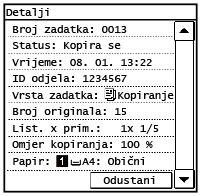 Prikazuje trenutni status odabrane stavke. Zaslon <Status zadatka kopir./ispis> prikazan ispod kao primjer.