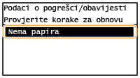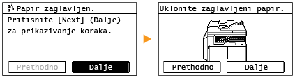 U nekim slučajevima pogreške prikazuju upute o otklanjanju pogreške. Da biste riješili problem, slijedite upute na zaslonu. Zaslon koji se prikazuje pri zaglavljenom papiru prikazan je ispod kao primjer (