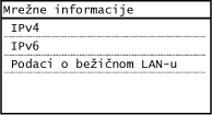 Prikazuje mrežne postavke, npr. IP adresu uređaja, i status, npr. stanje komunikacije putem bežičnog LAN-a.