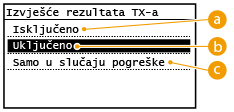 Odaberete li <Uključeno> ili <Samo u slučaju pogreške>, dio faksiranog dokumenta može biti uključen u izvješće. Dodirnite <Uključi TX sliku> na <Uključeno>.