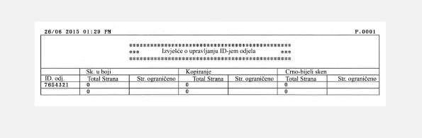 Ako je aktivirano upravljanje ID-brojem odjela, možete ispisati izvješće kako biste po ID-brojevima odjela provjerili ukupan broj kopiranih, ispisanih i skeniranih stranica. Izvješće vam omogućuje nadgledanje uporabe i unapređenje upravljanja.