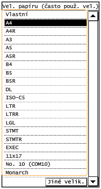 Pokud se velikost vloženého papíru nenachází mezi zobrazenými možnostmi, klepněte na tlačítko <Jiné velik.>.
