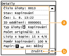 Zobrazí se počet kopií, nastavení a další údaje. Chcete-li si pouze zkontrolovat údaje, aniž byste rušili kopírování, vraťte se na hlavní obrazovku kopírování stisknutím tlačítka