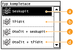 Při přípravě více kopií vícestránkových dokumentů můžete vybrat <Skupina>, <Třídit>, <Otočit + seskupit> nebo <Otočit + třídit> jako pořadí kopírovaných papírů. Tato funkce je užitečná při přípravě materiálů pro schůzky nebo prezentace.