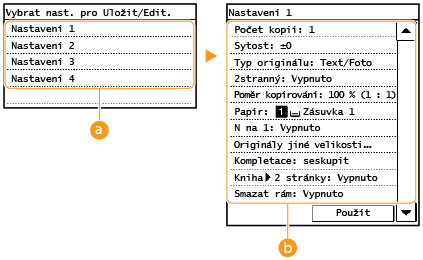 Můžete uložit až čtyři kombinace často používaného nastavení kopírování. V případě potřeby jednoduše vyberete uloženou kombinaci nastavení a nebudete muset při každém kopírování konfigurovat stejné nastavení. Například když často nastavujete počet kopií na hodnotu 5, nastavte možnost <Smazat rám> na hodnotu <Zapnuto> a zvyšte ostrost při kopírování. Kombinace nastavení lze uložit jako <Nastavení 1> až <Nastavení 4>.