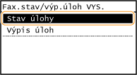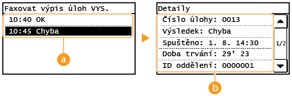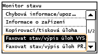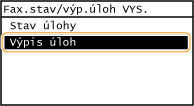 ![]() <Faxovat výpis úloh VYS.> / <Faxovat výpis úloh PŘ.>Umožňuje zobrazit seznam odeslaných a přijatých dokumentů. <OK> se zobrazí, jestliže byl dokument úspěšně odeslán nebo přijat, a <Chyba> se zobrazí, jestliže se odeslání nebo příjem dokumentu nezdařil z důvodu zrušení nebo výskytu chyby.