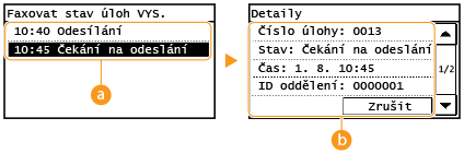 <Detaily>Umožňuje zobrazení podrobných informací týkajících se dokumentů vybraných ze seznamu. Pokud je zadán větší počet míst určení, zobrazí se na obrazovce jejich počet. Chcete-li zkontrolovat podrobnosti o více zadaných místech určení, klepněte na tlačítko <Mís. určení>. Pokud objevíte nepotřebný dokument, stiskněte tlačítko <Zrušit> nebo <Smazat> a klepněte na tlačítko <Ano>.