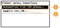 Klepnete-li na možnost <Zapnuto>, vytiskne se hlášení automaticky vždy po uskutečnění 40 přenosů. Pokud nechcete tisknout hlášení automaticky, vyberte možnost <Vypnuto>.