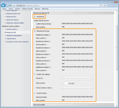 Adresy IPv6 zařízení lze konfigurovat pomocí vzdáleného uživatelského rozhraní. Před nastavením adres IPv6 zkontrolujte nastavení adresy IPv4 (Zobrazení nastavení IPv4). Chcete-li používat adresy IPv6, je třeba správně nastavit adresu IPv4. Upozorňujeme, že v prostředí IPv6 není dostupná funkce skenování pomocí ovladače skeneru nebo nástroje MF Toolbox. Zařízení může používat až devět z následujících adres IPv6: