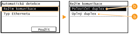 klepněte na možnost <Poloviční duplex> nebo <Úplný duplex>.![]() <Poloviční duplex>Buď zasílá, nebo přijímá komunikační data. Zvolte, pokud je zařízení připojeno k síťovému zařízení používajícímu poloviční duplex.