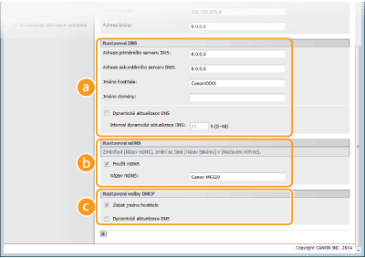 mDNS (multicast DNS) je protokol přijatý službou Bonjour, který slouží k přiřazení názvu hostitele k adrese IP bez použití systému DNS. Chcete-li funkci mDNS povolit, zaškrtněte políčko a zadejte název mDNS do textového pole [Název mDNS:]. [Nastavení volby DHCP][Získat jméno hostitele]