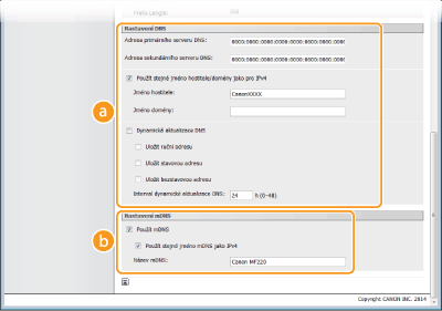 Zaškrtněte toto políčko, chcete-li dynamicky aktualizovat záznamy služby DNS při každé změně adresy IP zařízení. Pokud chcete zadat typ nebo typy adres, které chcete uložit na server DNS, zaškrtněte políčko pro [Uložit ruční adresu:], [Uložit stavovou adresu:] nebo [Uložit bezstavovou adresu]. Interval mezi aktualizacemi lze zadat v hodinách do textového pole [Interval dynamické aktualizace DNS:]. [Nastavení mDNS][Použít mDNS]