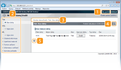 Zobrazí stav právě tištěných dokumentů a historii vytištěných, kopírovaných, odeslaných a přijatých dokumentů. Můžete také ověřit stav zařízení.