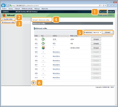 Zobrazí čísla kódovaných voleb uložená v adresáři. Pokud jste přihlášeni v režimu správce systému, lze také ukládat či měnit položky adresáře.