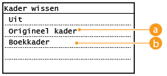 Wanneer u documenten kopieert die kleiner zijn dan het uitvoerpapierformaat, verschijnen er mogelijk kaderlijnen rond de randen in de gekopieerde afbeelding. Als u tegenover elkaar liggende pagina's van een dik boek kopieert, verschijnen er mogelijk donkere randen. Met <Kader wissen> kunt u deze kaderlijnen en donkere randen wissen.