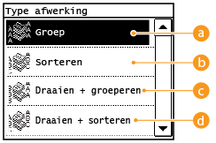 Als u meerdere kopieën wilt maken met meerdere pagina's, kunt u <Groep>, <Sorteren>, <Draaien + groeperen> of <Draaien + sorteren> selecteren om de volgorde van de kopieën in te stellen. Deze functie is handig bij het voorbereiden van hand-outs voor vergaderingen of presentaties.