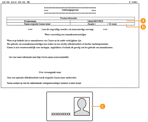 U kunt de documentatie van uw plaatselijke erkende Canon-dealer (visitekaartje, informatie etc.) scannen en registreren. U kunt zijn contactgegevens afdrukken als uw verbruiksartikelen bijna op zijn.