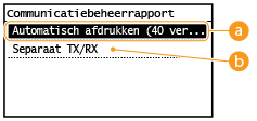 Tik op <Aan> om afzonderlijke rapporten af te drukken voor verzonden en ontvangen documenten, of op <Uit> om verzend- en ontvangstgegevens te combineren in één rapport.
