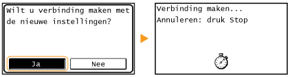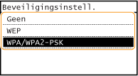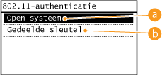 ![]() Als u <Open systeem> selecteert Wanneer u verbinding maakt met een draadloos LAN, treedt er op het apparaat een verificatiefout op als op de draadloze router verificatie met een gedeelde sleutel is ingeschakeld. Als dat gebeurt, wijzigt de machine de instelling automatisch naar <Gedeelde sleutel> en probeert opnieuw verbinding te maken. |