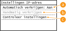 ![]() ![]() Als u DHCP/BOOTP/RARP niet wilt gebruiken om een IP-adres toe te wijzen Selecteer <Uit>. Als u <DHCP>, <BOOTP> of <RARP> selecteert terwijl deze services niet beschikbaar zijn, zal het apparaat tijd en communicatiebronnen verspillen door in het netwerk te zoeken naar deze services. |