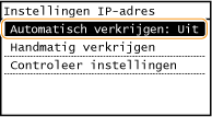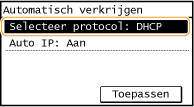 ![]() Als <Aan> wordt weergegeven, tikt u op <Automatisch verkrijgen> en stelt u zowel <Selecteer protocol> als <Auto IP> in op <Uit>.
