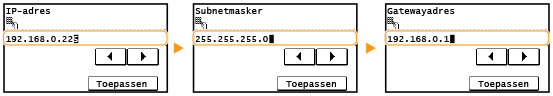 <Subnetmasker> <Gatewayadres>.Voer elke instelling in met de numerieke toetsen en tik op <Toepassen>.
