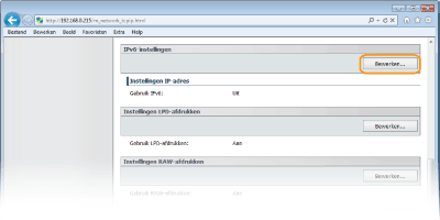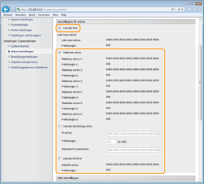 De IPv6-adressen van het apparaat kunnen worden geconfigureerd via de UI op afstand. Controleer voordat u IPv6-adressen instelt, de instellingen van het IPv4-adres (IPv4-instellingen weergeven). U moet de juiste IPv4-instellingen opgeven om te kunnen werken met IPv6-adressen. De scanfunctie die gebruikmaakt van het scannerstuurprogramma of MF Toolbox is niet beschikbaar in een IPv6-omgeving. Het apparaat kan maximaal negen van de onderstaande IPv6-adressen gebruiken: