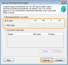 ![]() ![]() Als het apparaat niet wordt gevonden Klik op [Vernieuwen]. Als het probleem blijft optreden, klikt u op [IP address] (IP-adres) of [MAC address] (MAC-adres), voert u het IP-adres of MAC-adres van het apparaat in (Netwerkinstellingen weergeven) en klikt u op [Next] (Volgende).