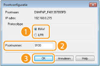 Selecteer het keuzerondje [LPR] of [RAW] bij [Protocoltype], wijzig desgewenst het nummer in het tekstvak [Poortnummer] en klik op [OK].