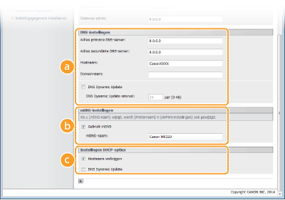 mDNS (multicast DNS) wordt ondersteund door Bonjour en is een protocol voor het koppelen van een hostnaam aan een IP-adres zonder DNS te gebruiken. Schakel dit selectievakje in om mDNS in te schakelen en voer de mDNS-naam in het vak [mDNS-naam:] in. [Instellingen DHCP-opties][Hostnaam verkrijgen]
