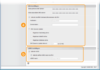 Schakel dit selectievakje in om de DNS-records dynamisch bij te werken wanneer het IP-adres van het apparaat verandert. Als u een of meer adrestypen wilt opgeven die u wilt registreren op de DNS-server, schakelt u het selectievakje [Registreer handmatig adres:], [Registreer stateful adres:] of [Registreer stateless adres] in. Als u een interval wilt instellen tussen updates, typt u de tijd in uren in het vak [7]. [mDNS-instellingen][Gebruik mDNS]