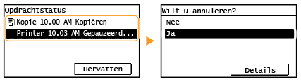 Annuleren vanuit de UI op afstandU kunt het afdrukken annuleren vanaf de pagina [Afdrukken: Opdrachtstatus] van de UI op afstand: De huidige status van afdruktaken controleren