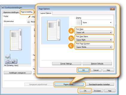 Als u datums, aanmeldingsnamen of paginanummers gaat afdrukken, kunt u opmaakinstellingen wijzigen zoals het lettertype en de tekengrootte. Klik op het scherm Pagina-opties hierboven op [Indelingsinstellingen] om de opmaakinstellingen op te geven.