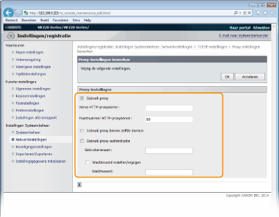 Als u het wachtwoord voor proxyverificatie wilt instellen of wijzigen, schakelt u het selectievakje in en typt u maximaal 24 tekens voor het nieuwe wachtwoord in het vak [Wachtwoord:].