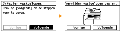 Als het papier is vastgelopen, wordt <Papier vastgelopen.> weergegeven op het scherm. Druk op <Volgende> om eenvoudige oplossingen weer te geven. Als u de procedures op het scherm niet goed begrijpt, raadpleegt u de volgende gedeeltes om storingen te verhelpen.