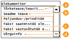 , siis kuvatakse kuva, mille kaudu saate vaadata prinditavate, saadetavate või vastu võetavate dokumentide olekut ja ka seadme olekut (nt tooneritase) või võrguseadete teavet (nt seadme IP-aadress).